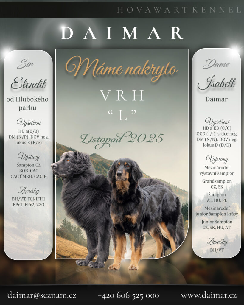 Přijímáme předběžné rezervace na štěňátka Hovawarta po naší úžasné, výstavně velmi úspěšné černoznakaté Isabell Daimar a krásném, pohodovém, vymazleném černém Elendilovi od Hlubokého parku.